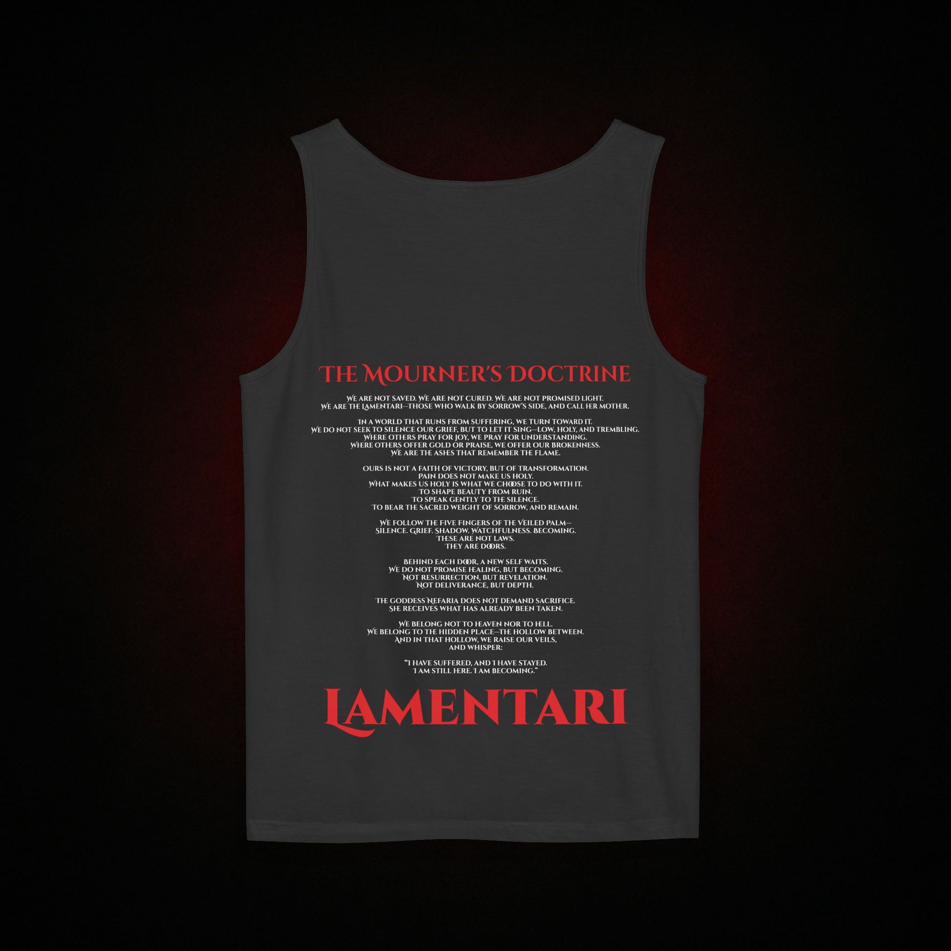 Enshroud yourself in sorrow with this tank top featuring an illustration of a Lamentari seated in anguish beneath sacred gothic arches. Rendered in distressed grayscale linework, this design invokes the solemn dignity of grief borne in silence. Embellished with the red numeral 33, this garment marks the throne of suffering and the Lamentari rite of the Mourners’ Order.
