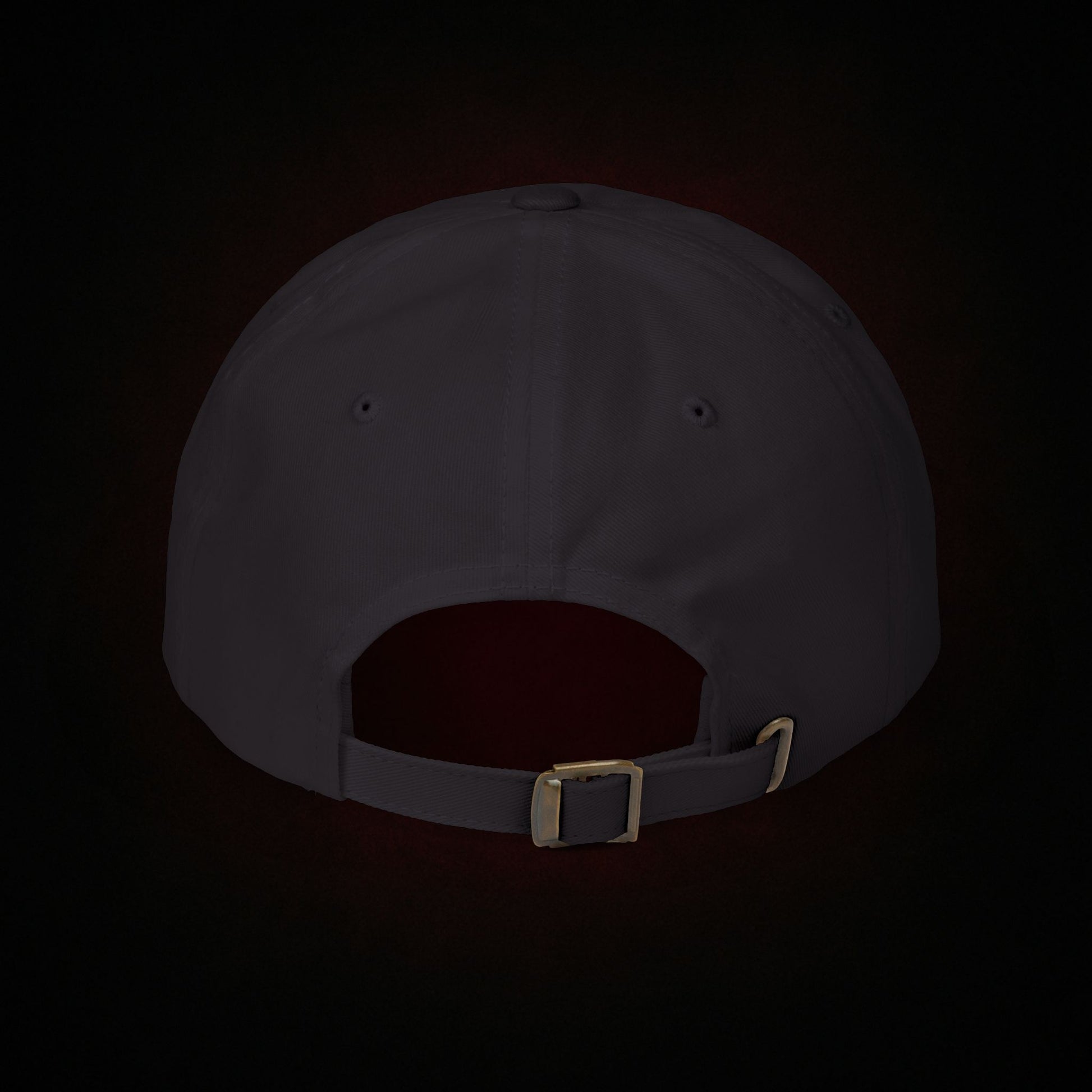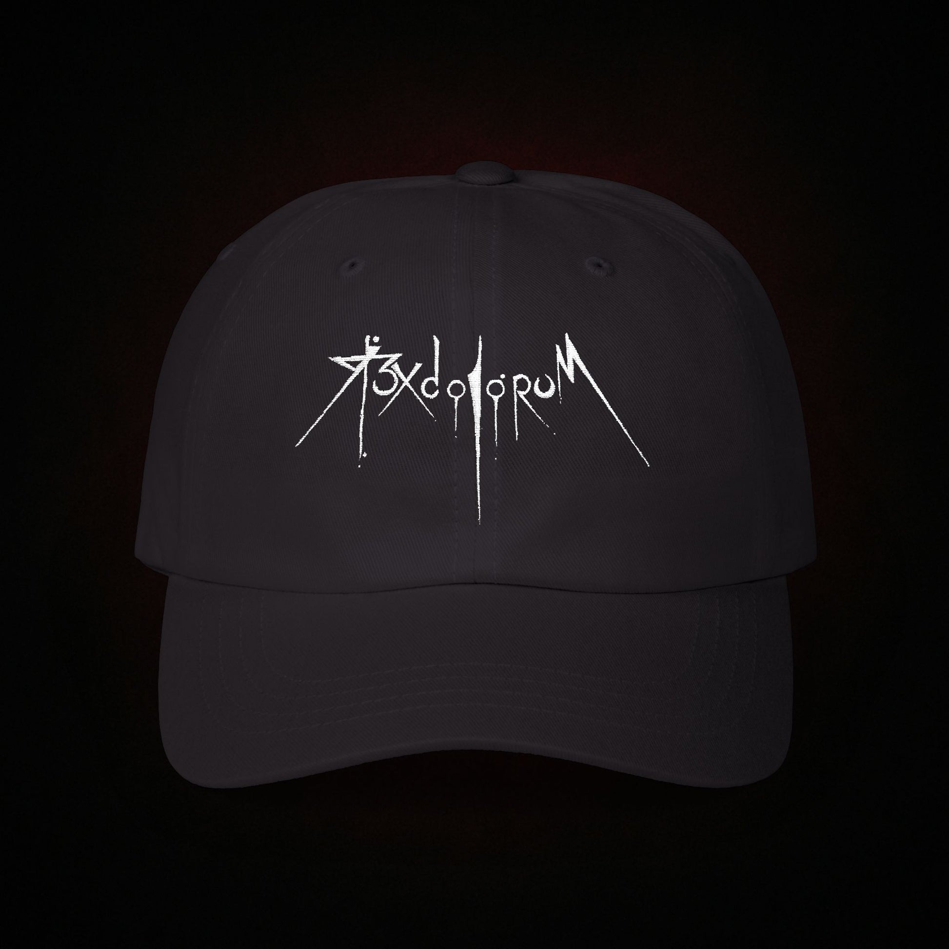 This embroidered black cap bears the thin, jagged sigil of Rex Dolorum. The threads trail like whispered regrets.